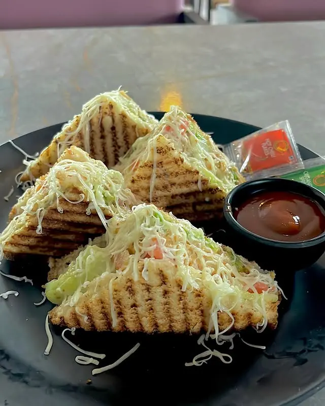 Loaded veg grilled sandwich topped with extra cheese, served hot and crispy.