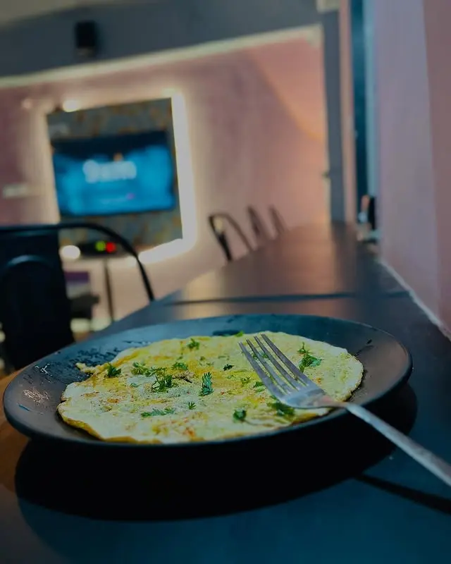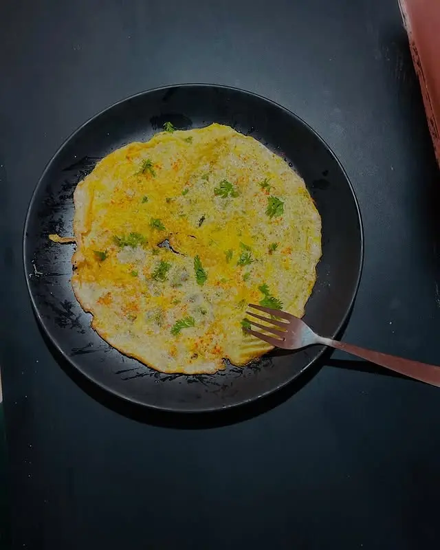 A fluffy omelet seasoned with fresh herbs and spices for a homely, tasty bite.
